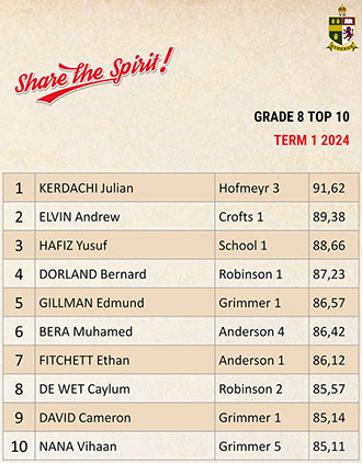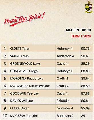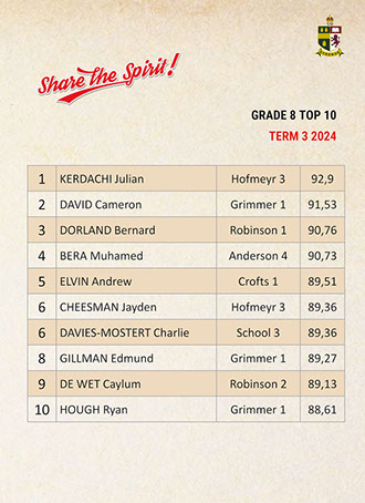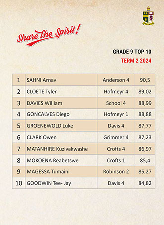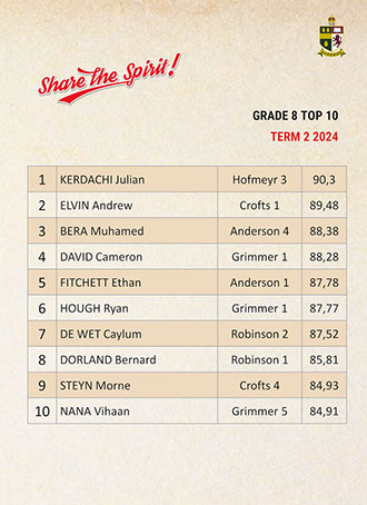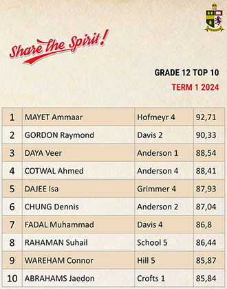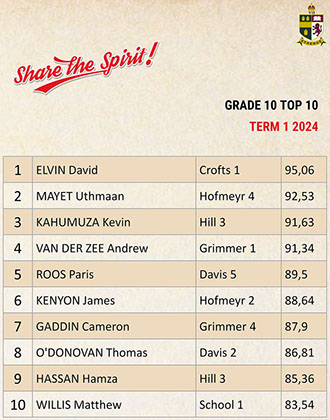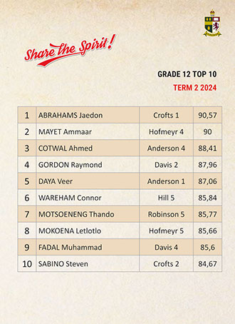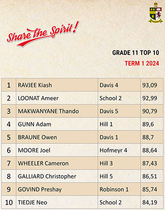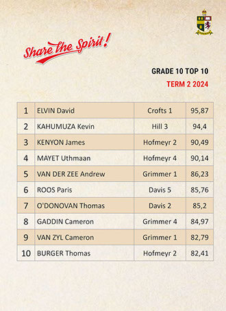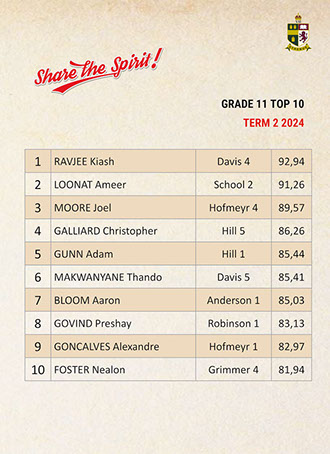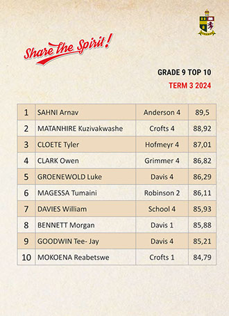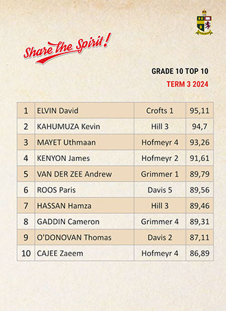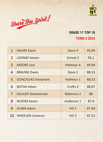 Jaedon Abrahams, Dennis Chung, Ahmed Cotwal, Veer Daya, Kamogelo Dladla, Muhammad Fadal, James Francis, Hamza Gani, Raymond Gordon, Tapiwa Magwenzi, Maqocwandile Mangaliso, Rebaone Moeng, Letlotlo Mokoena, Thando Motsoeneng, Aarav Narandas, Chisom Oradiegwu, Zaid Patel, Tyler Ruckard, Steven Sabino, Gradon Stevenson, Connor Wareham, Joshua Weimar Absent: Ammaar MayetTOP 10 ACADEMIC RESULTSTerm 3 2024 - Grade 11